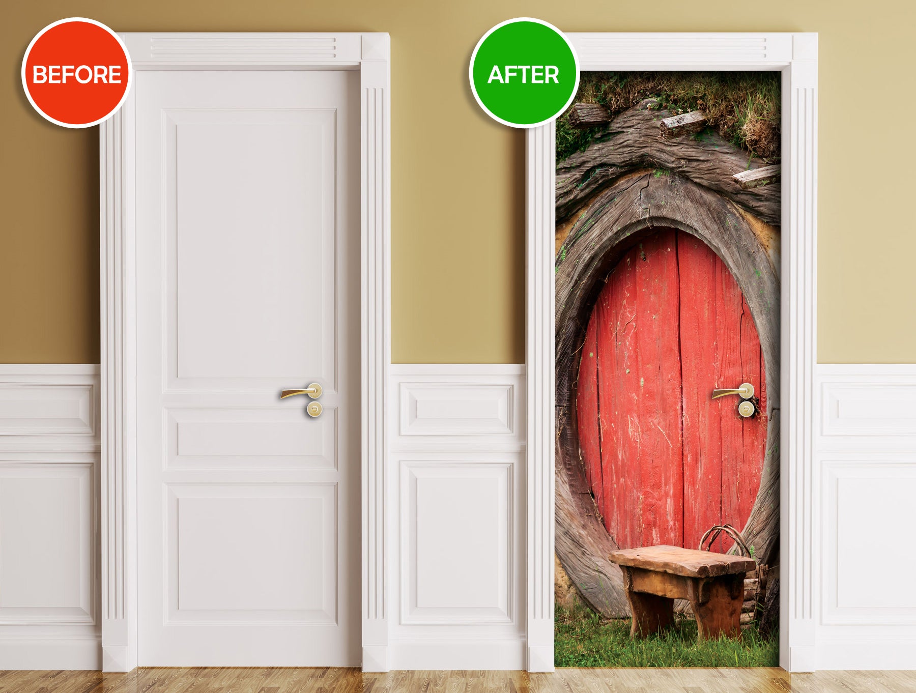 Full door size mural. Red oval hole. Hobbit house door sticker. Refrigerator sticker cover. Self-adhesive. Single piece. Made in Europe. High definition print.