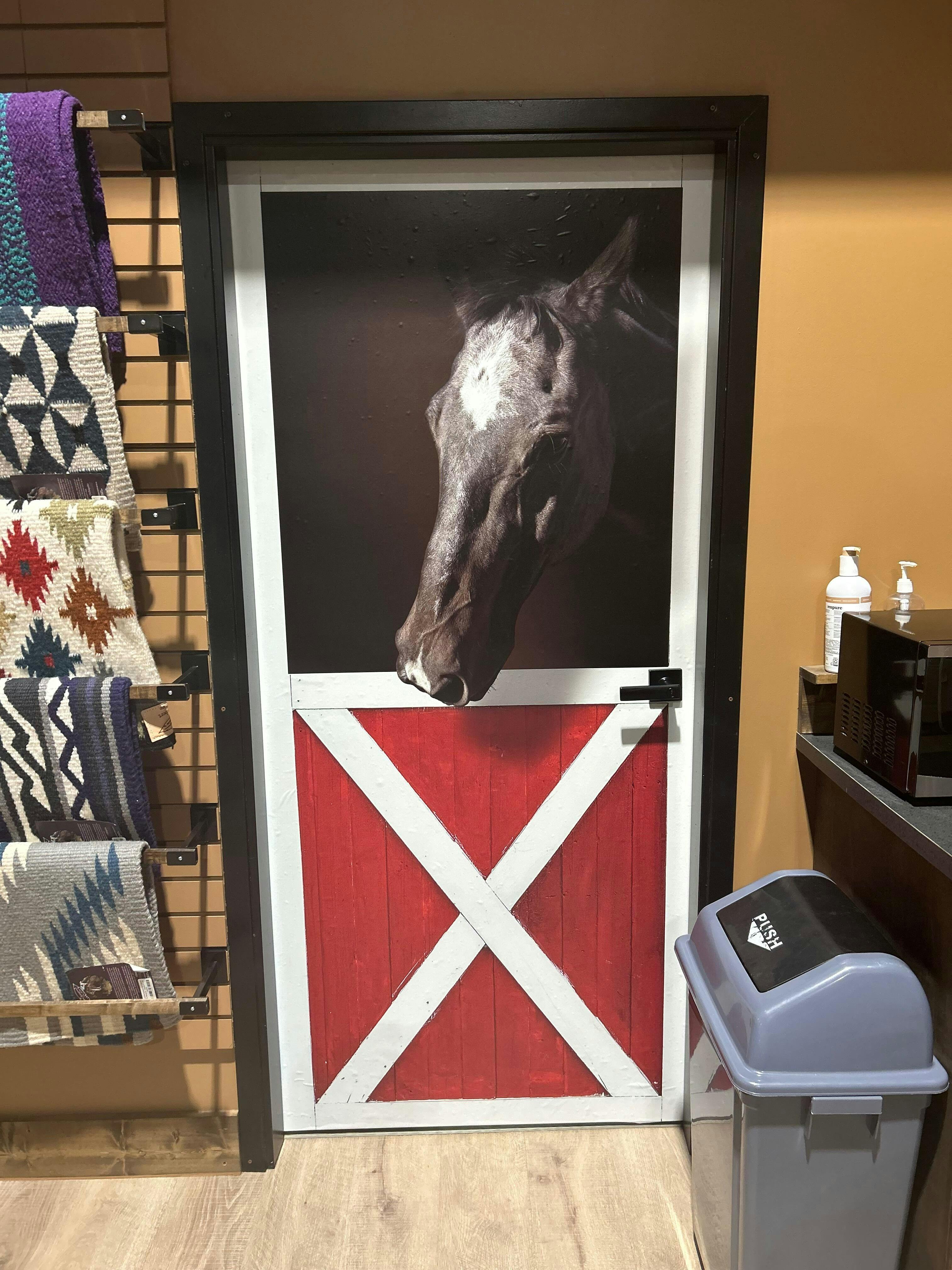 Door sticker mural. A Horse behind the red stable door. Self-adhesive. 1 piece. Made in Europe. High definition print.